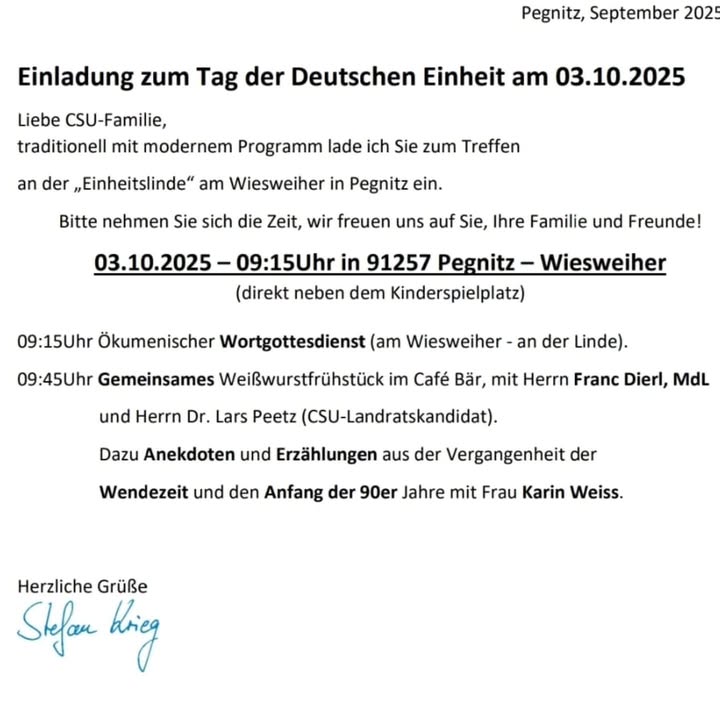 mehr"Pegnitz braucht mehr WIR."🤝Am Tag der Deutschen Einheit erinnern wir uns nicht nur an die Geschichte unseres Landes, sondern auch an das, was unsere Stadtgemeinschaft ausmacht: Zusammenhalt, Freiheit, Verantwortung.In einer Zeit, in der sich vieles verändert ? von der Digitalisierung bis zur Energieversorgung ? braucht es Menschen, die zuhören, mitdenken und gemeinsam gestalten.Stefan Krieg steht für ein Pegnitz, in dem:✅ Demokratie vor Ort gelebt wird✅ digitale Chancen auch im Kleinen ankommen✅ Geschichte und Heimatbewusstsein Teil der Zukunftsplanung sind✅ das WIR wieder stärker zählt ? nicht nur in Wahlzeiten, sondern jeden Tag💬 Lasst uns unsere Stadt weiterentwickeln ? offen, ehrlich und miteinander.#TagDerDeutschenEinheit #StefanKrieg #CSUPegnitz #PegnitzGestalten #GemeinschaftLeben #Bürgernähe #DemokratieVorOrt #DigitalisierungMitVerantwortung #WerteErhalten #StefanKriegtsHin